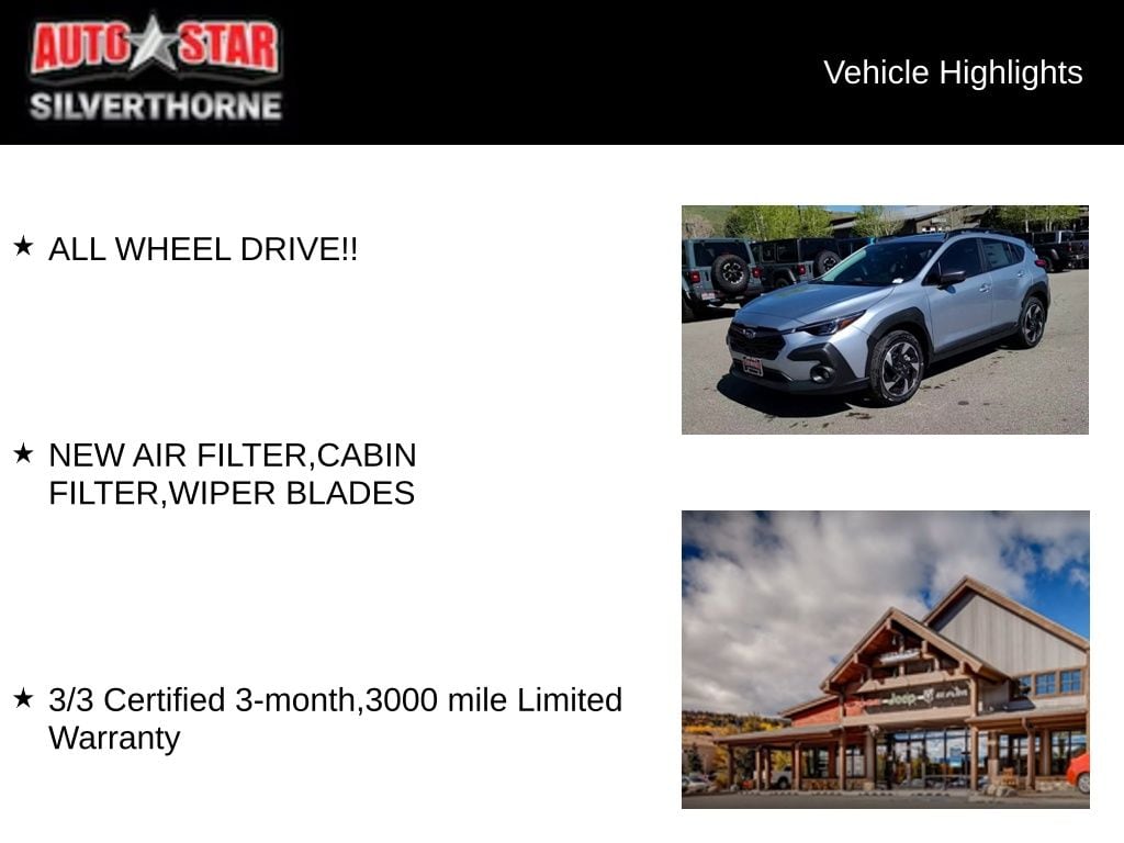2024 Subaru Crosstrek Limited Check out all these great option's 3.70 Axle Ratio, 4-Wheel Disc Brakes, 6 Speakers, ABS brakes, Air Conditioning, Alloy wheels, AM/FM radio: SiriusXM, Anti-whiplash front head restraints, Auto High-beam Headlights, Automatic temperature control, Brake assist, Bumpers: body-color, Driver door bin, Driver vanity mirror, Dual front impact airbags, Dual front side impact airbags, Electronic Stability Control, Emergency communication system: STARLINK Safety and Security (Subscription Required), Exterior Parking Camera Rear, Four wheel independent suspension, Front anti-roll bar, Front Bucket Seats, Front Center Armrest, Front dual zone A/C, Front fog lights, Front reading lights, Fully automatic headlights, Heated door mirrors, Heated Front Bucket Seats, Heated front seats, Illuminated entry, Knee airbag, Leather Shift Knob, Leather-Trimmed Upholstery, Low tire pressure warning, Occupant sensing airbag, Outside temperature display, Overhead airbag, Overhead console, Panic alarm, Passenger door bin, Passenger vanity mirror, Power door mirrors, Power driver seat, Power steering, Power windows, Radio data system, Radio: Subaru STARLINK 11.6" Multimedia Plus Sys, Rear anti-roll bar, Rear seat center armrest, Rear window defroster, Rear window wiper, Remote keyless entry, Security system, Speed control, Speed-sensing steering, Split folding rear seat, Spoiler, STARLINK/Apple CarPlay/Android Auto, Steering wheel mounted audio controls, Tachometer, Telescoping steering wheel, Tilt steering wheel, Traction control, Trip computer, Turn signal indicator mirrors, Variably intermittent wipers, and Wheels: 18" x 7.0J Dark Gray Aluminum Alloy.