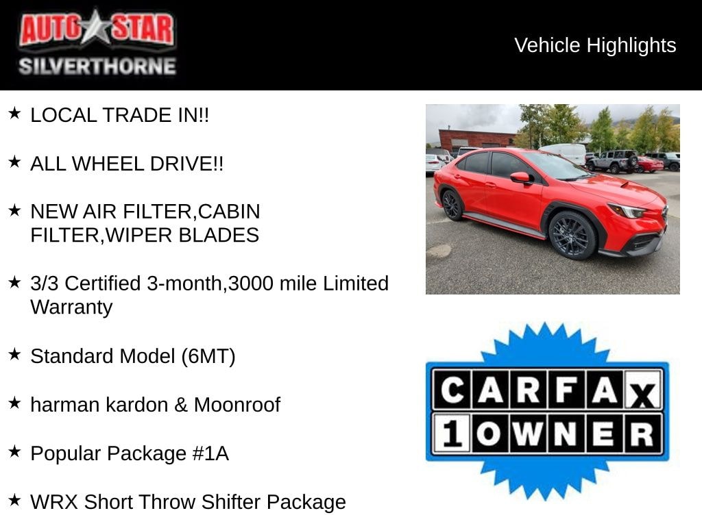 2024 Subaru WRX Premium Check out all these great option's harman kardon & Moonroof (harman/kardon Speaker System and Power Tilt Up Moonroof), Popular Package #1A (Auto-Dimming Exterior Mirror w/Approach Light, Auto-Dimming Mirror w/Compass & HomeLink, Cargo Tray, LED Upgrade, and Side Sill Plates - Illuminated), Standard Model (6MT), WRX Short Throw Shifter Package (STI Shift Knob - 6MT and STI Short Throw Shifter (WRX)), 4-Wheel Disc Brakes, 6 Speakers, ABS brakes, Air Conditioning, Alloy wheels, AM/FM radio: SiriusXM, Auto High-beam Headlights, Auto-dimming Rear-View mirror, Automatic temperature control, Brake assist, Bumpers: body-color, Driver door bin, Driver vanity mirror, Dual front impact airbags, Dual front side impact airbags, Electronic Stability Control, Emergency communication system: STARLINK Safety and Security (Subscription Required), Exterior Parking Camera Rear, Four wheel independent suspension, Front anti-roll bar, Front Bucket Seats, Front Center Armrest, Front dual zone A/C, Front fog lights, Front reading lights, Fully automatic headlights, Heated door mirrors, Heated front seats, Illuminated entry, Knee airbag, Leather Shift Knob, Leather steering wheel, Low tire pressure warning, Occupant sensing airbag, Outside temperature display, Overhead airbag, Overhead console, Panic alarm, Passenger door bin, Passenger vanity mirror, Performance Design Heated Front Bucket Seats, Power door mirrors, Power steering, Power windows, Premium Cloth Upholstery w/Red Stitching, Radio data system, Radio: Subaru STARLINK 11.6" Multimedia Plus Sys, Rear anti-roll bar, Rear seat center armrest, Rear window defroster, Remote keyless entry, Security system, Speed control, Speed-sensing steering, Split folding rear seat, Spoiler, Sport steering wheel, STARLINK/Apple CarPlay/Android Auto, Steering wheel mounted audio controls, Tachometer, Telescoping steering wheel, Tilt steering wheel, Traction control, Trip computer, Variably intermittent wipers, and Wheels: 18" x 8.5" Dark Gray Finish Alum Alloy.