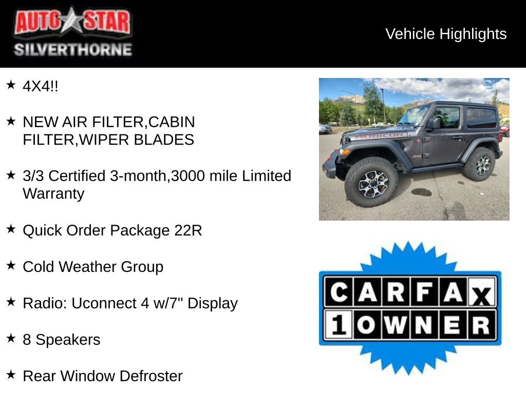 2021 Jeep Wrangler Rubicon Check out all these great option's Cold Weather Group (Heated Front Seats and Heated Steering Wheel), Quick Order Package 22R, 8 Speakers, Air Conditioning, Automatic temperature control, Black 3-Piece Hard Top, Freedom Panel Storage Bag, Front dual zone A/C, No Soft Top, Radio: Uconnect 4 w/7" Display, Rear Window Defroster, Rear Window Wiper/Washer, 4-Wheel Disc Brakes, 4.10 Rear Axle Ratio, ABS brakes, Alloy wheels, AM/FM radio: SiriusXM, Apple CarPlay/Android Auto, Brake assist, Compass, Delay-off headlights, Driver door bin, Driver vanity mirror, Dual front impact airbags, Dual front side impact airbags, Electronic Stability Control, Front anti-roll bar, Front Bucket Seats, Front Center Armrest w/Storage, Front fog lights, Front License Plate Bracket, Front reading lights, Fully automatic headlights, Garage door transmitter, Heated door mirrors, Illuminated entry, Integrated roll-over protection, Leather steering wheel, Low tire pressure warning, Manuf Statement of Origin, Occupant sensing airbag, Outside temperature display, Panic alarm, ParkView Rear Back-Up Camera, Passenger door bin, Passenger vanity mirror, Performance Suspension, Power door mirrors, Power steering, Power windows, Premium Cloth Low-Back Bucket Seats, Radio data system, Rear anti-roll bar, Rear reading lights, Remote keyless entry, Remote Proximity Keyless Entry, Remote Start System, Security system, Speed control, Steering wheel mounted audio controls, Tachometer, Telescoping steering wheel, Tilt steering wheel, Traction control, Trip computer, Variably intermittent wipers, Voltmeter, and Wheels: 17" x 7.5" Machined w/Black Pockets.
