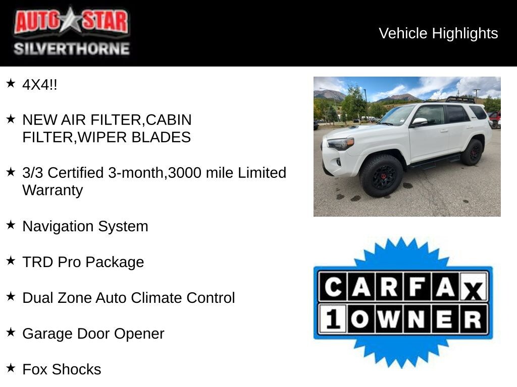 4X4!!, NEW AIR FILTER,CABIN FILTER,WIPER BLADES, 3/3 Certified 3-month,3000 mile Limited Warranty, Black Lug Nuts, Dual Zone Auto Climate Control, Fog Lights, Fox Shocks, Garage Door Opener, Heated Outside Rear-View Mirrors, Moonroof w/Tilt Up & Slide, Multi-Terrain Back Monitor, Navigation System, Roof Rack, TRD Pro All Weather Floor Liner, TRD Pro Badging, TRD Pro Exhaust, TRD Pro Package, TRD Shift Knob, Wheel Locks.