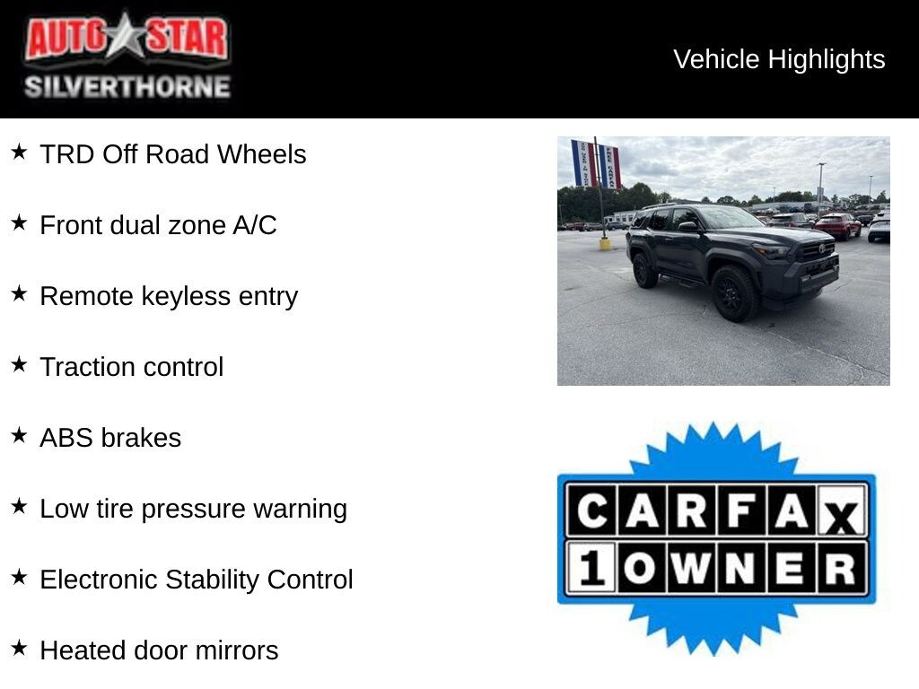 2025 Toyota 4Runner SR5 TRD Off Road Wheels Check out all these great option's ABS brakes, Alloy wheels, Electronic Stability Control, Front dual zone A/C, Heated door mirrors, Illuminated entry, Low tire pressure warning, Remote keyless entry, Traction control, 4-Wheel Disc Brakes, 8 Speakers, Air Conditioning, AM/FM radio: SiriusXM, Anti-whiplash front head restraints, Apple CarPlay/Android Auto, Auto High-beam Headlights, Automatic temperature control, Brake assist, Bumpers: body-color, Driver door bin, Driver vanity mirror, Dual front impact airbags, Dual front side impact airbags, Emergency communication system: Safety Connect (1-year trial), Exterior Parking Camera Rear, Fabric Seat Trim (FA), Front anti-roll bar, Front Bucket Seats, Front Center Armrest, Front fog lights, Front reading lights, Front wheel independent suspension, Knee airbag, Leather Shift Knob, Leather steering wheel, Occupant sensing airbag, Outside temperature display, Overhead airbag, Overhead console, Panic alarm, Passenger door bin, Passenger vanity mirror, Power door mirrors, Power steering, Power windows, Radio: 8" Audio, Rear anti-roll bar, Rear seat center armrest, Rear side impact airbag, Rear window defroster, Rear window wiper, Security system, Speed control, Speed-sensing steering, Split folding rear seat, Spoiler, Steering wheel mounted audio controls, Tachometer, Telescoping steering wheel, Tilt steering wheel, Trip computer, Variably intermittent wipers, and Wheels: 17" Dark-Gray Painted Alloy.